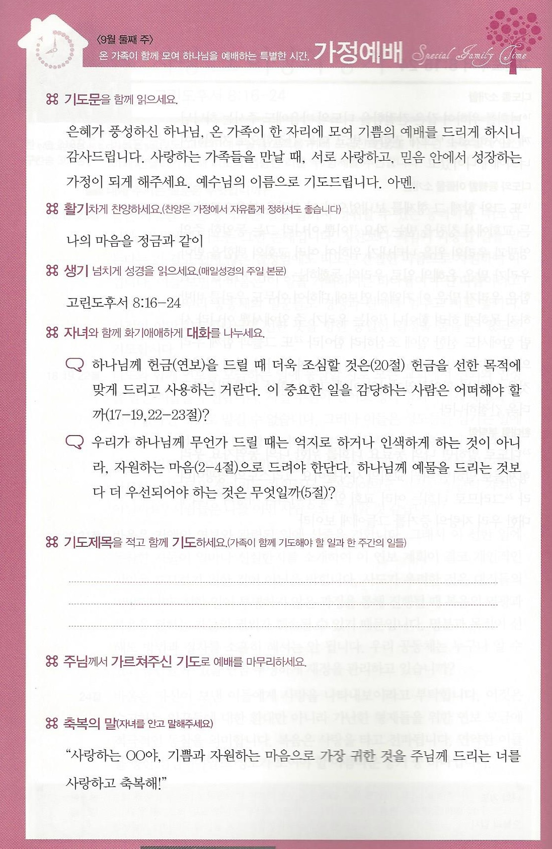*가정예배지는 '매일성경'의 가정예배 순서지로 가정예배 드릴 수 있습니다.
